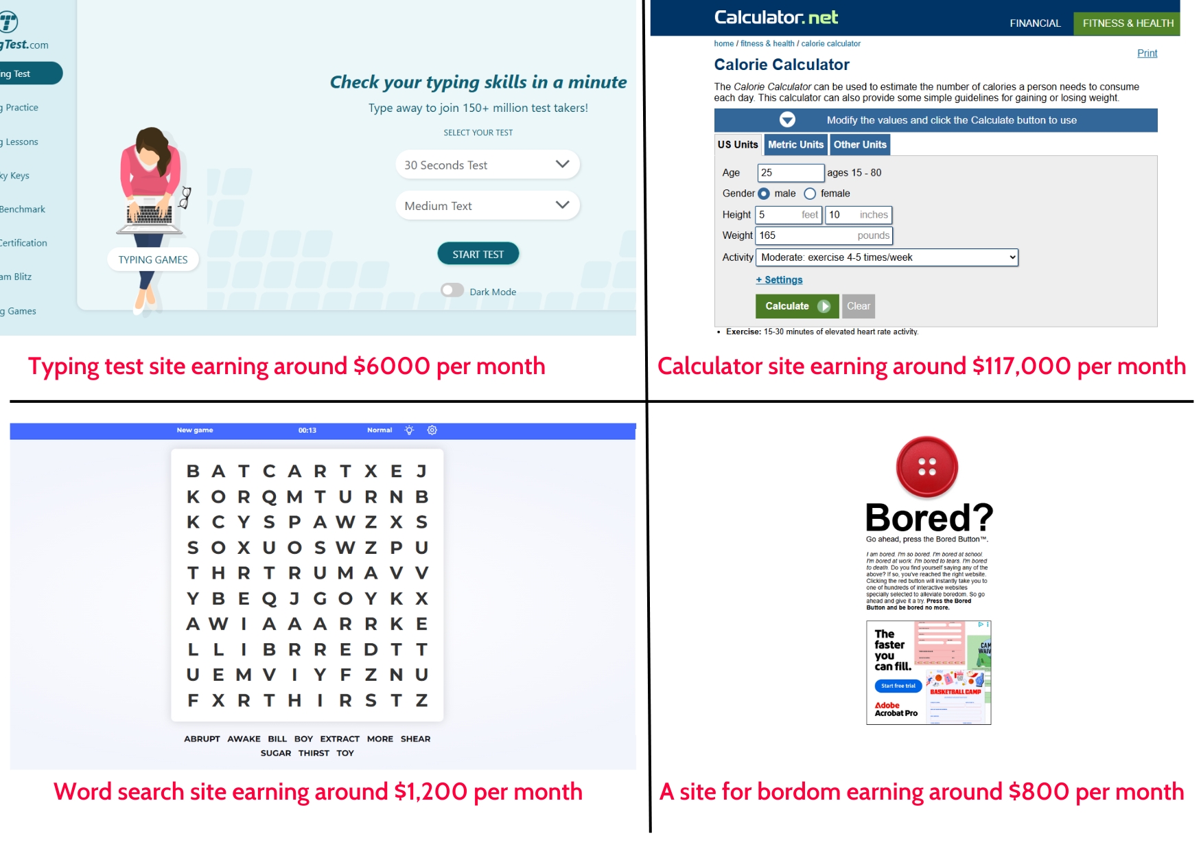 There are many success stories. There is a site with just typing tests, and is getting millions of visitors each month. That means profit! There are many simple sites with games on them. There are puzzle generator sites. There are sites that create educational and recreational PDF downloads. The limit might just be our imagination of what to create.